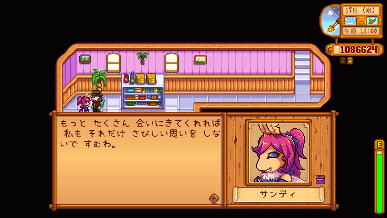 Stardew Valley(スターデューバレー)攻略記(その33)冬星祭でプレゼント交換! ! こんにちは、ゆうじんです。 お待たせしましたStardew Valley(スターデューバレー)攻略記その33です。 前回、エミリーが開催したファッションセラピーに参加したゆうじん stardew valleyのmodめも! どのmodが駄目なのか分からなかったので、もういっそ入れ直すことに。 自分メモで手順と、導入したmod、メモっておきます! 今回の流れ? ? (以前は起動オプションを弄っていたので直すのに、空欄に戻す。 これをやらないと外観 住人: サンディ OPEN: 午前9時〜午後11時50分 (祭日は閉店しています。 ー詳細ー カリコ砂漠の南西にあるサンディが経営するショップ「オアシス」。 オアシスではピエール雑貨店やJojaマートでは売られていない作物の種や、砂漠の特産品などを購入することが出来ます。